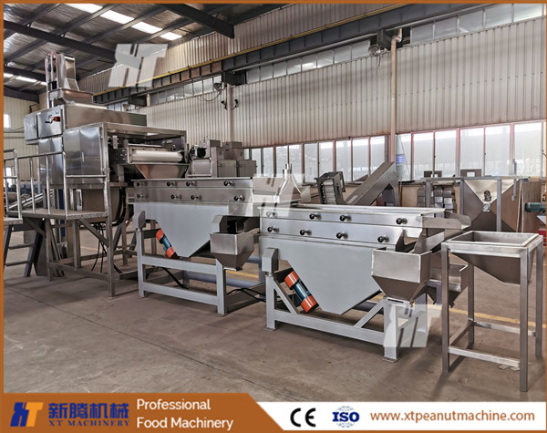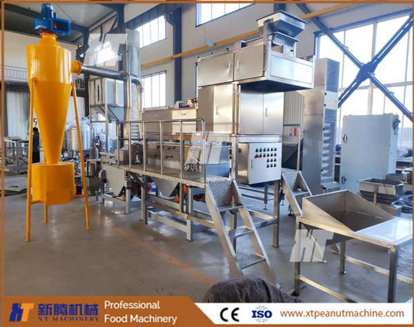 Peanut chopping machine has two stage chopping process, when split blanched peanuts are feed into chopper via vertical conveyor, material is chopped into coarse grain by 1st chopping device, then flow into 2nd stage chopping and become mixing granulators. With the function of vibrating sifter, it is sorted into 4 uniform specifications. Generally the chopped size is divided into 5-8, 8-10, 10-12mesh, below 12mesh is powder texture.
